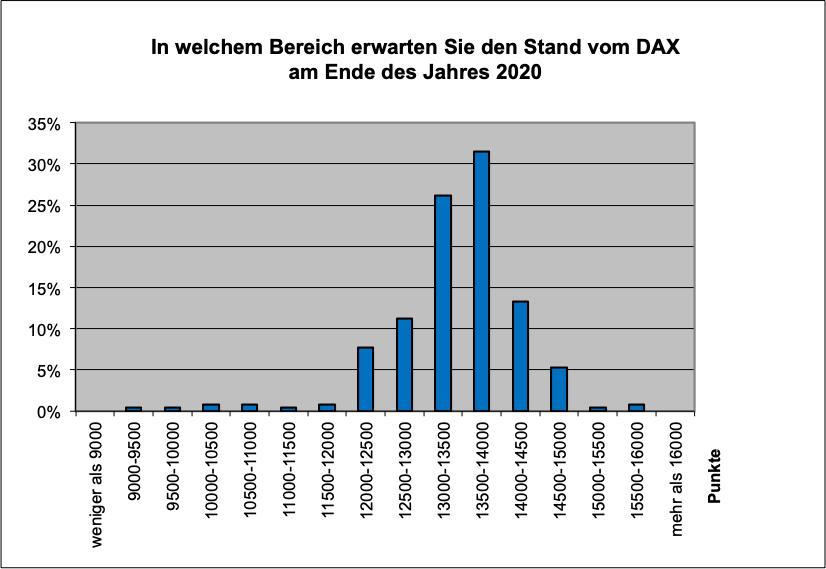 Nur wenig besser sieht es aus, wenn wir den Median der Anlegererwartungen selektieren: Mit 13.750 Punkten (+3,8%) sieht es nicht viel besser aus. Nur 20% halten einen DAX-Stand von über 14.000 Punkten Ende 2020 für möglich. Mehr als +5,7% traut also kaum jemand dem DAX zu.